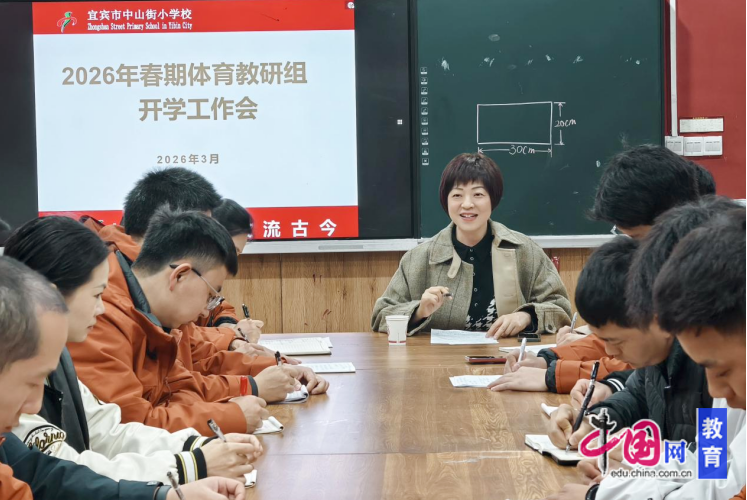 为深入贯彻落实教育部2026年新春第一会“落实五育并举,聚焦体育锻炼”精神,全面推进学生身心健康工作,近日,宜宾市中山街小学校召开体育教研组新学期工作会。会议以“明确方向、压实责任,全面提升学校体育工作质量”为主题,围绕“215”刚性要求、“课间520微运动”创新实践、高质量课堂建设等核心议题展开深入研讨。学校党委副书记、校长张萍,副校长陈雪、袁玲及全体体育教师参加会议。