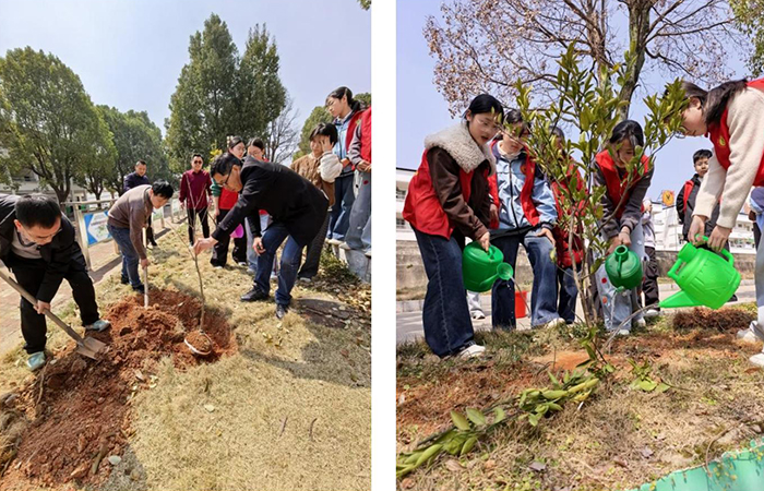 活动现场,师生志愿者分工协作、干劲十足。校领导们率先垂范,挥锹挖坑、扶苗定植;学生志愿者在方席胜的带领下,培土围堰、提水浇灌,每一道工序都认真细致、有条不紊。大家相互配合、默契协作,汗水与笑容相映,劳动与奉献同行,让雷锋精神在春日的校园里熠熠生辉。