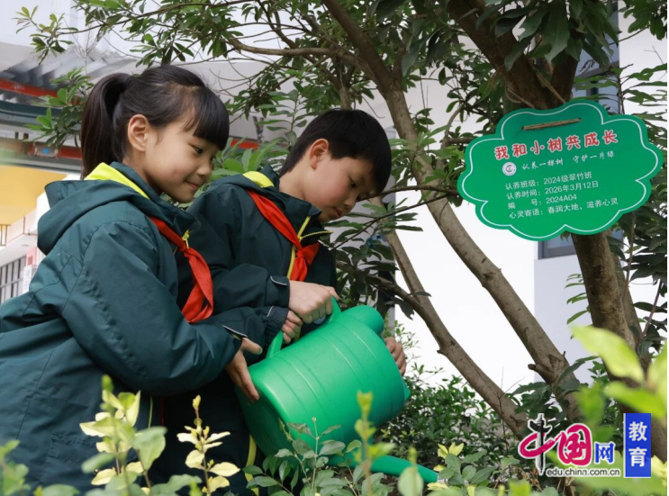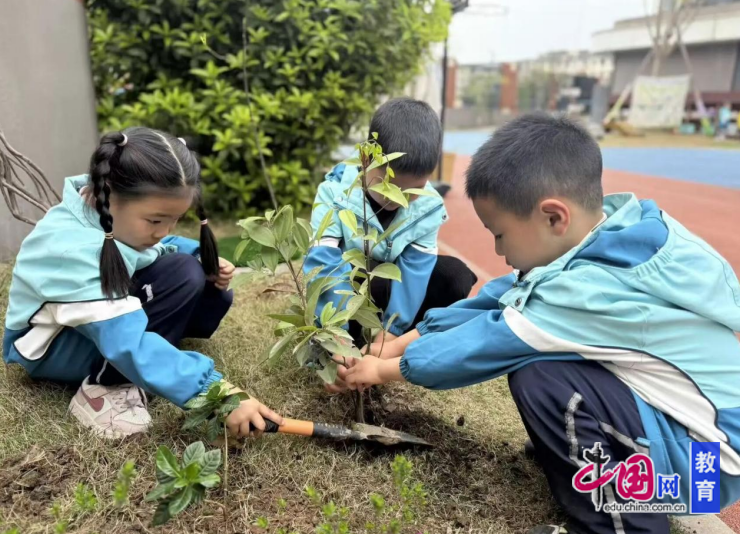南街小学的孩子们化身为“绿色小园丁”,走进渔唱社区,亲手种下希望的小树苗;“植树节剧场”里,稚嫩的童声正讲述着绿色的故事;校园中,“植物角”里生机盎然;特别的“我在邛崃有棵树”活动,让家长、老师和孩子共同栽下“成长纪念树”。从社区植绿到校园护绿,孩子们在劳动与实践中,将生态文明的种子悄悄种进心田,用纯真童心为美丽家园增添最动人的春色。