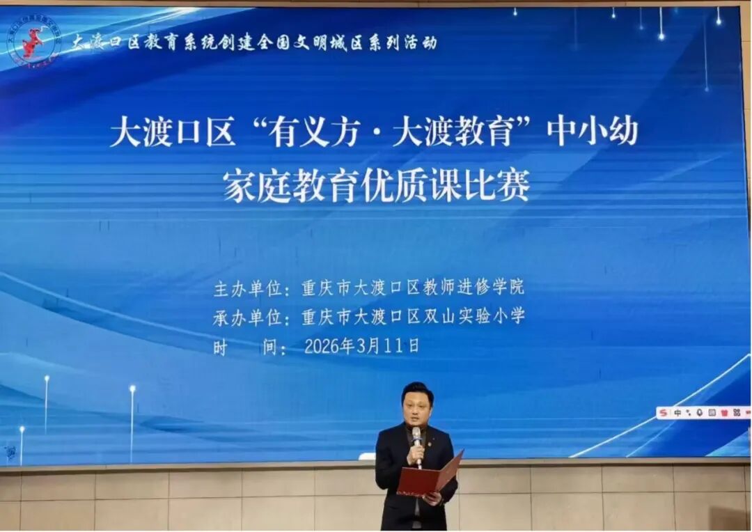 3月12日,大渡口区教育系统以创建全国文明城区为契机,在重庆市大渡口区双山实验小学成功举办2025-2026学年“有义方·大渡教育”中小幼家庭教育优质课比赛。此次活动由大渡口区教师进修学院主办、大渡口区双山实验小学承办,大渡口区教师进修学院副院长王代光、德育研究中心主任朱渝娜、家庭教育教研员蒋林老师,以及来自各学校分管德育工作的负责人、德育干部、家庭教育指导教师和42名参赛选手共同参加本次活动。