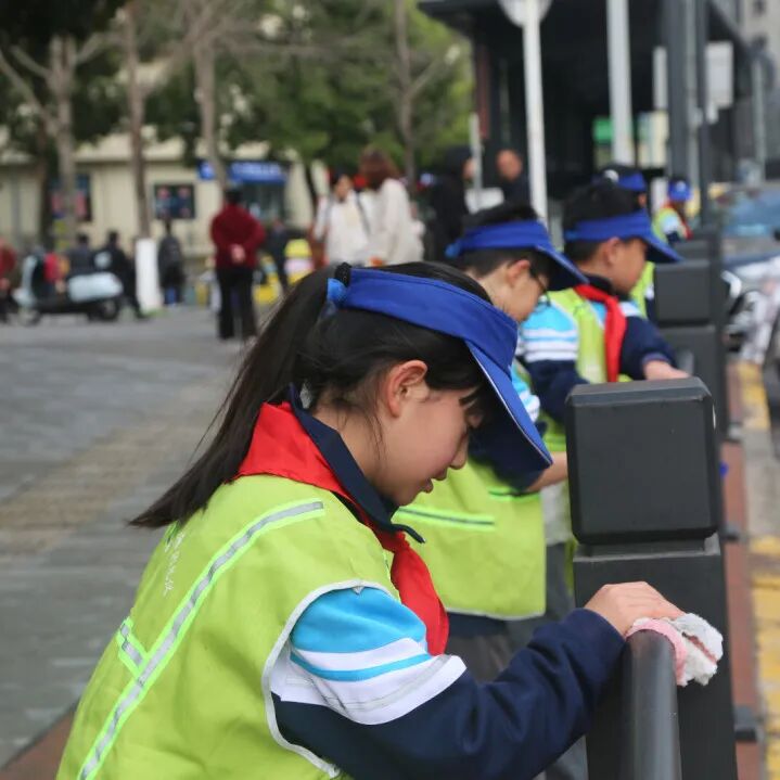 六年级2班同学带着清洁工具走进社区,擦拭公告栏与公共指示牌,焕新社区公共空间。