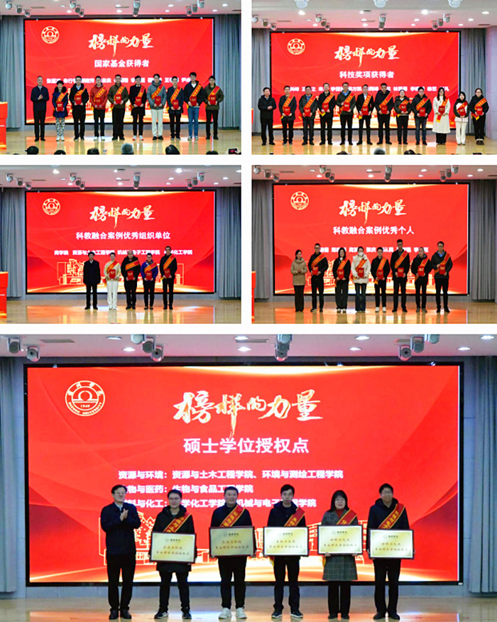 大会表彰环节,校领导闵杰、杨维志、邢存海、王红艳分别为近三年国家基金获得者、科技奖项获得者、科教融合案例优秀组织单位和个人颁奖。校党委书记李红为获得硕士学位授权点的单位授牌。