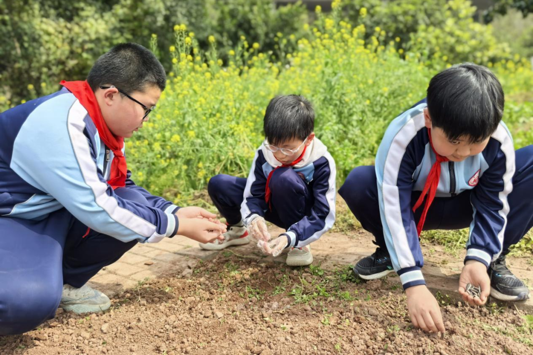 孩子们在老师与园艺师的指引下分工协作,将对新生命的珍视融入每一个动作。百草园中栽下花苗,盼其绽放芳华;花坛里栽种花株,为校园缀上斑斓;状果园间播撒种子,盼其向阳生长。挖坑、撒种、培土、浇水、插标牌,每一个动作都虔诚认真,每一份付出都饱含对生命的敬畏。