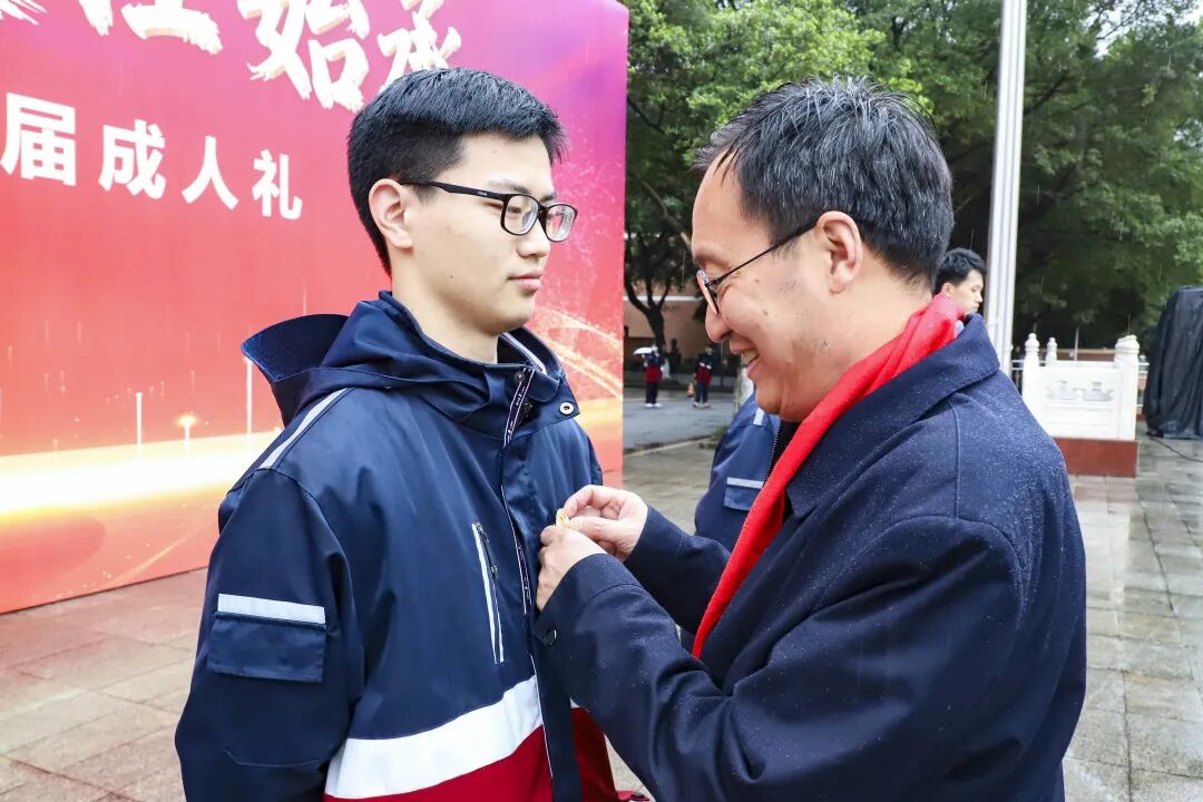 随后,庄重的冠礼仪式正式举行。各班学生代表有序登台,校领导与家长共同为他们佩戴成人纪念章,郑重递上《中华人民共和国宪法》。一枚徽章,凝聚十八载春华秋实;一本宪法,彰显成年公民的权利与义务。全体学子齐声诵读《少年中国说》,铿锵字句、意气风发,尽显南华少年的蓬勃朝气与家国担当。