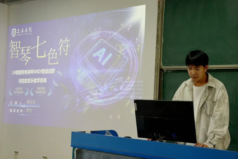 他们以解决音乐初学者识谱难、找键难的痛点为出发点,在该专业黄恒一教师指导下,将AI算法、嵌入式技术与音乐教学深度融合。系统核心实现了三大关键创新:独创“音符—七色视觉映射”法则,把复杂乐谱转化为直观的色彩和图形提示,实时投射在辅助设备上,让抽象乐理变成可追随的光点;搭载设备精准识别与自动重连功能,适配各类使用场景;实现无杂音低延迟的音频输出,演奏体验远超传统教学方式,填补了便携电钢琴智能教学的技术空白。