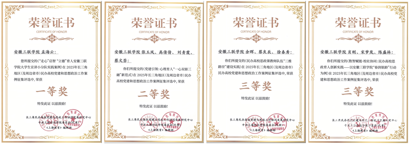 近日,2025年度长三角地区(及周边省市)民办高校党建和思想政治工作案例征集评选结果公布,安徽三联学院选送的《“走心”启智“立德”育人—安徽三联学院大学生宣讲小分队实践案例》《党建引领:心理育人“一心双驱三融”新范式》《民办高校思政课教师队伍“三维路径”建设实践》《数智赋能·校社协同:民办高校思政育人创新实践—以安徽三联学院“春润银龄”行动为例》四篇工作案例全部获奖,其中一等奖1项、二等奖1项、三等奖2项。