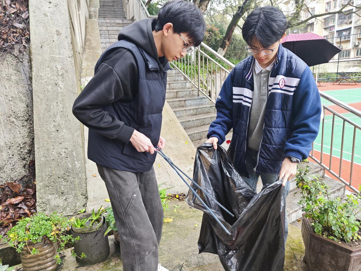 活动当日,恰逢春日细雨,校园笼罩在一片朦胧之中。志愿者们并未受天气影响,准时集合,手持长钳、垃圾袋等清洁工具,以小组形式分散至校园各绿化区域。大家重点对教学楼前后、主干道两侧的花坛、灌木丛及草坪深处进行了细致排查与清理。这些地方因位置隐蔽,容易积存平日清扫中难以触及的垃圾,如被丢弃的烟蒂、零食包装袋、塑料碎片等。志愿者们俯身细致捡拾,不放过任何一个角落,即便雨水打湿了衣服,也丝毫没有减退大家的劳动热情。整个过程井然有序,体现出良好的团队协作精神。