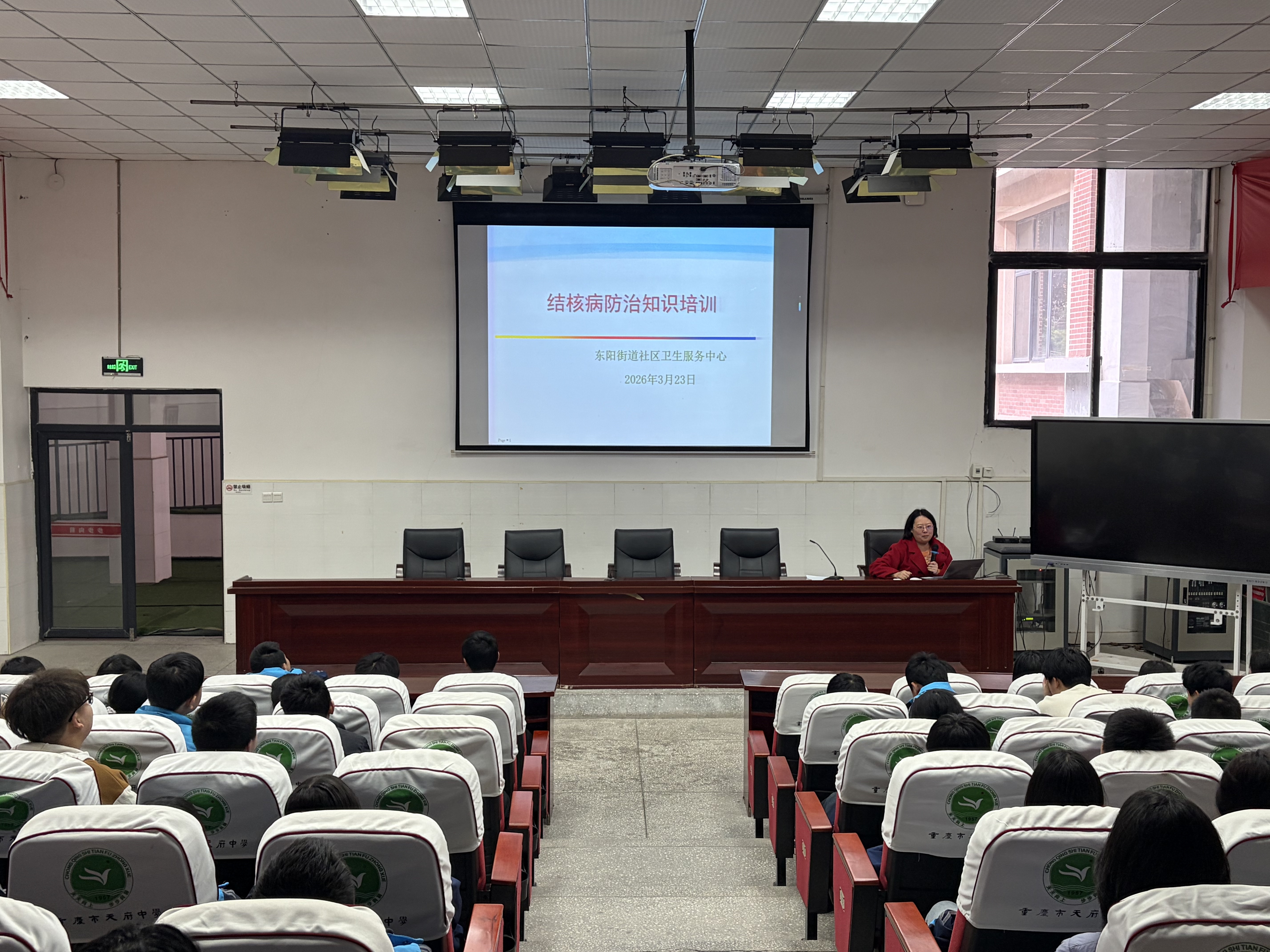 为深入贯彻“健康第一”的教育理念,切实加强学生卫生健康教育,2026年3月18日,重庆市天府中学特邀重庆市北碚区东阳街道社区卫生服务中心专业医疗团队走进校园,为全体学生带来了一场内容丰富、生动实用的卫生健康专题讲座。此次活动成功搭建了医校协同育人的桥梁,将专业的医疗健康服务送至学生身边。