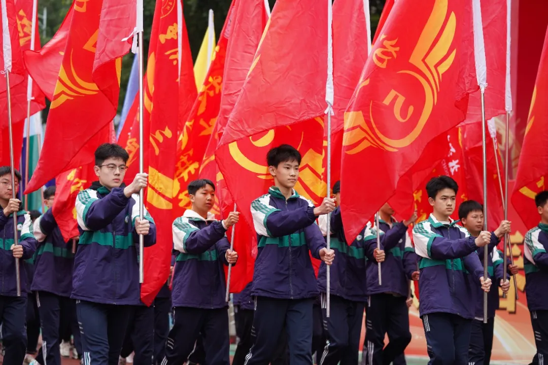 激昂的进行曲响起,国旗队与彩旗队迈着铿锵有力的步伐入场。旗手们身姿如松,目光如炬,鲜艳的五星红旗在春风中猎猎作响。彩旗方阵紧随其后,红橙黄绿青蓝紫,如流动的彩虹掠过操场,点燃了全场的热情。