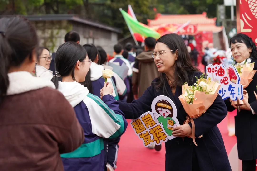 活动尾声,最温暖的一幕上演:家长牵着孩子的手,一起走过“青春门”。老师和学校领导分列红毯两旁,老师们与自己班的孩子一一击掌,为他们加油鼓劲;校领导们高举着写有“超常发挥”“青春无悔”的手牌,用一句句温暖的话语,为每一个孩子送上祝福。