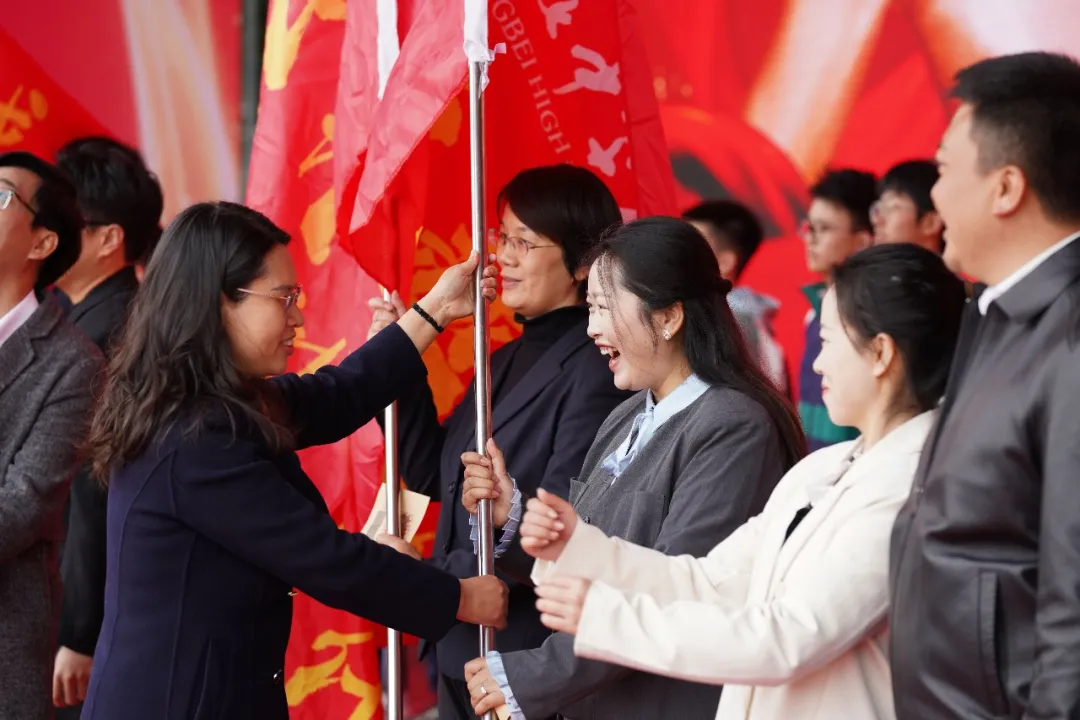 学校党委副书记、校长冉崇娟将战旗逐一交到17位班主任手中。接过旗帜,班主任们奋力挥舞,鲜红的战旗迎风猎猎。