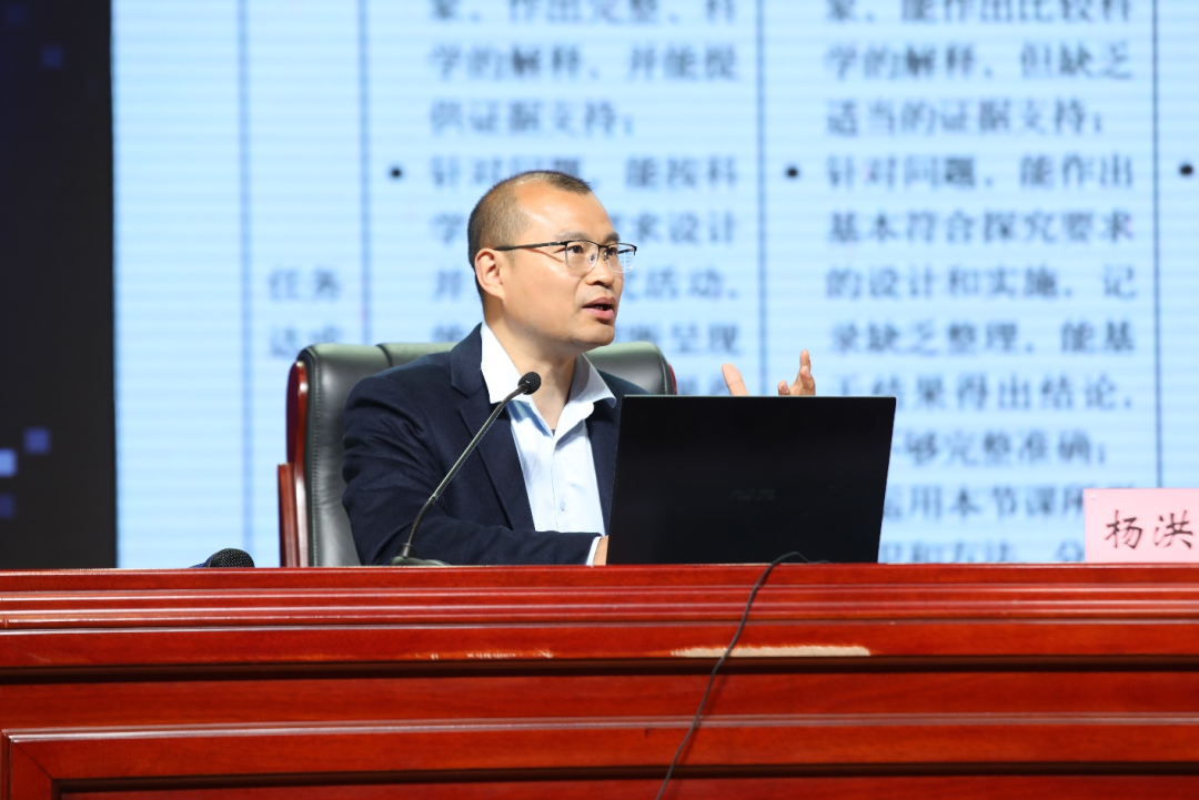研讨会最后,重庆市教科院生物学教研员杨洪斌对全市高三生物学备考工作进行全面指导。他深入剖析示范课设计逻辑,强调课堂教学应回归科学探究本质,聚焦批判性与论证性思维培养,构建“主张-证据-理由-反驳”的教学闭环。他结合2025年高考命题趋势,对2026年重庆生物学高考的命题方向进行前瞻部署,指出要坚守教考衔接、夯实基础、合理难度、优化呈现等原则,紧扣教材,强化核心概念、实验探究与规范答题训练,确保备考科学、精准、高效。