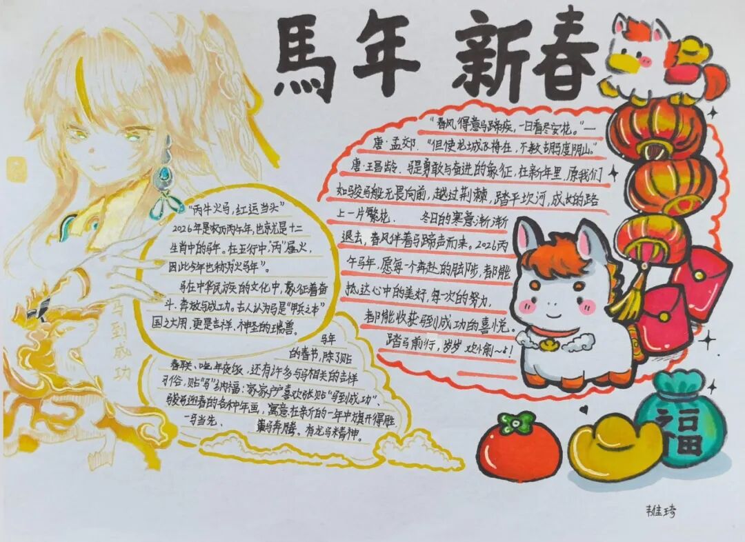 综合学科让学生结合马年特色,围绕马年的习俗、传说、吉祥寓意等内容,发挥创意,制作马年元素手抄报,将传统文化与动手实践相结合,培养了学生的动手能力、审美能力,传承中华优秀传统文化,增添了节日的喜庆氛围。