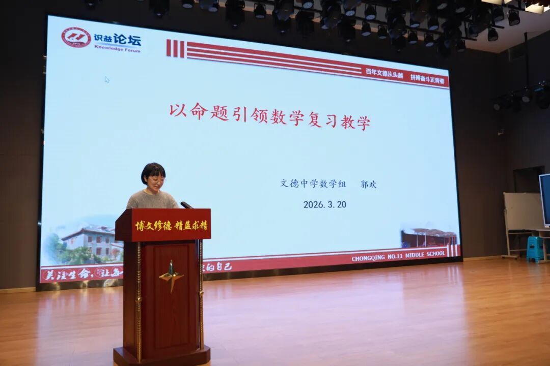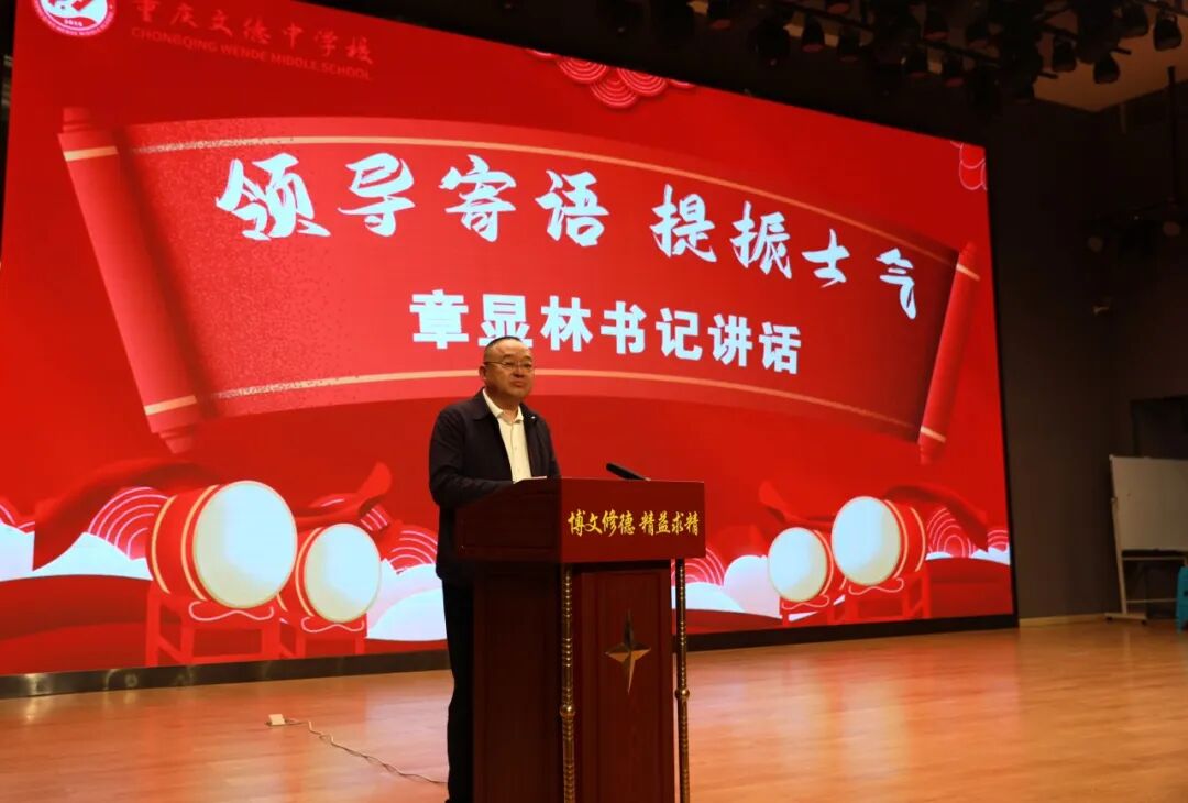 2026年3月20日,重庆文德中学江南新城校区拾益演播厅内气氛庄重热烈,初三年级教师动员大会在此举行。十一中教育集团党委书记章显林、十一中纪委书记常蕊、文德中学校副校长周霞、文德中学校副校长刘宇及全体行政干部出席了本次大会。大会以“凝心聚力逐金榜,笃行实干创辉煌”为主题,全体初三教师齐聚一堂,以饱满的热情与坚定的信念,吹响了冲刺中考的集结号,共同开启这段铸就辉煌的奋进征程。