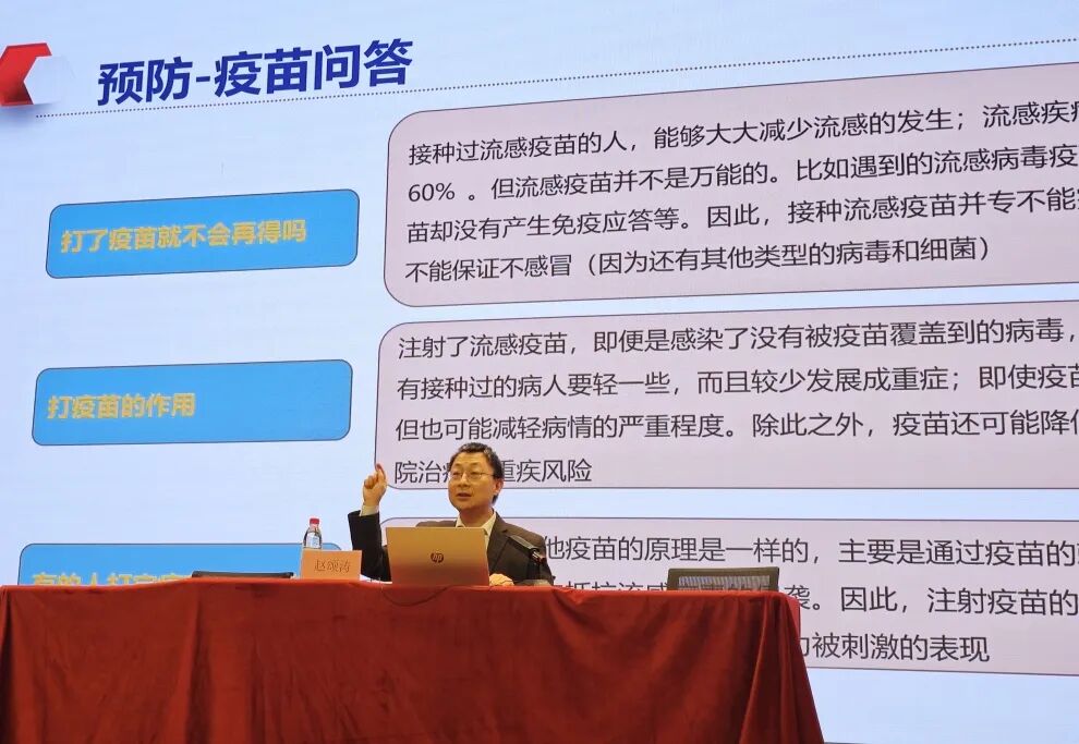 讲座中,赵颂涛副教授聚焦校园春季高发传染病,以流行性感冒和诺如病毒为案例,结合校园密集环境特点,通俗讲解两类传染病的传播途径、典型症状及危害 。他重点普及“勤洗手、常通风、少聚集、强体质”的防控原则,详细演示七步洗手法、正确咳嗽礼仪等实用技能,倡议同学们主动接种流感疫苗,提升自身免疫力 。课堂互动环节氛围活跃,赵教授耐心解答学生疑问,帮助大家将防护知识转化为行动自觉。