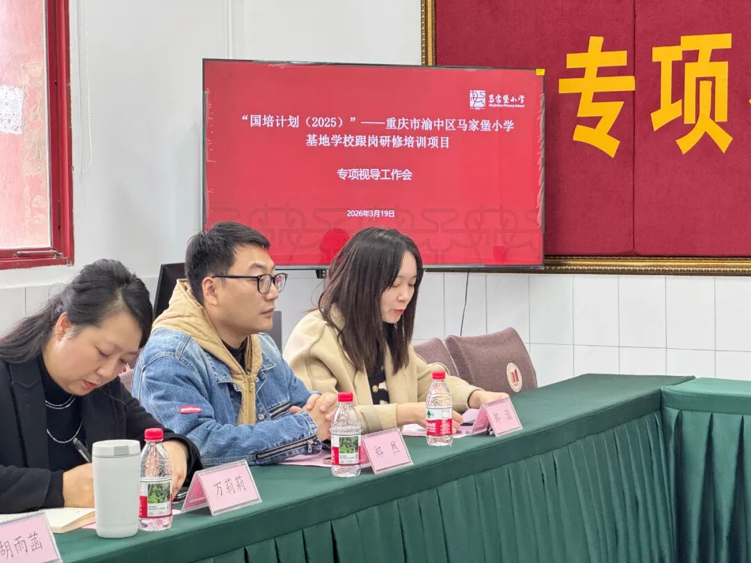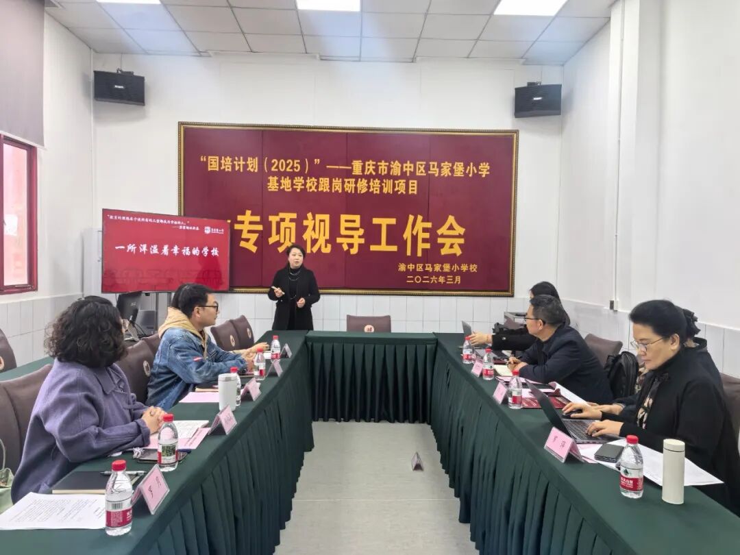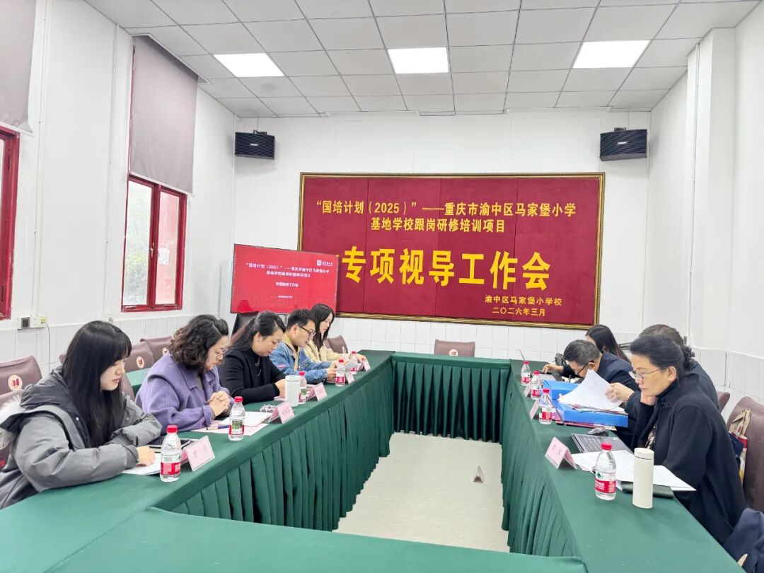 为扎实推进“国培计划(2025)”重庆市渝中区马家堡小学基地学校跟岗研修培训项目落地见效,充分发挥基地校示范辐射引领作用,2026年3月19日上午,市国培办专家组一行莅临重庆市渝中区马家堡小学校开展国培项目专项视导工作。视导专家组由重庆市中小学教师发展中心副主任杨冰、原江北区教师进修学院正高级教师罗萍、开州区教师进修学校正高级教师黎万江、市中小学教师发展中心高雪组成。学校校长万莉莉带领项目核心团队全程陪同,全方位汇报项目推进情况,接受专家组精准指导。
