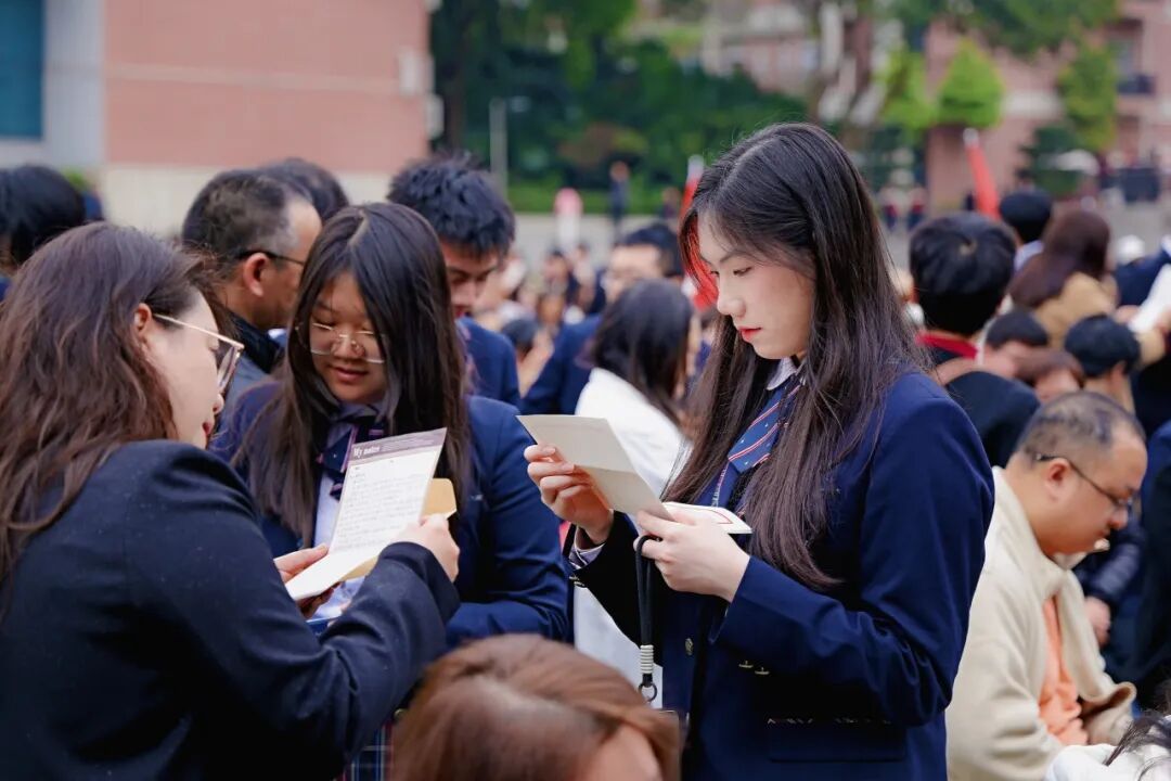 当孩子们打开父母写下的信,有人笑了,有人哭了,那些平日里说不出口的“我爱你”,那些藏在琐碎日常里的牵挂,此刻都化作了纸上最朴素的文字。“看着眼前熟悉的笔迹,你是否想起——从懵懂无知的孩童,长成今天挺拔自信的青年,每一步成长,都浸透着父母的心血与汗水。”