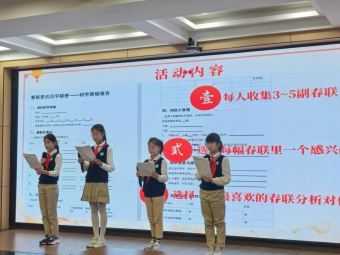 四班的“春联里的汉字密码”独具匠心。同学们不仅实地观赏春联,更亲手书写春联,在一笔一划间探寻汉字背后的文化内涵,于实践中解锁了传统文字的奇妙密码。