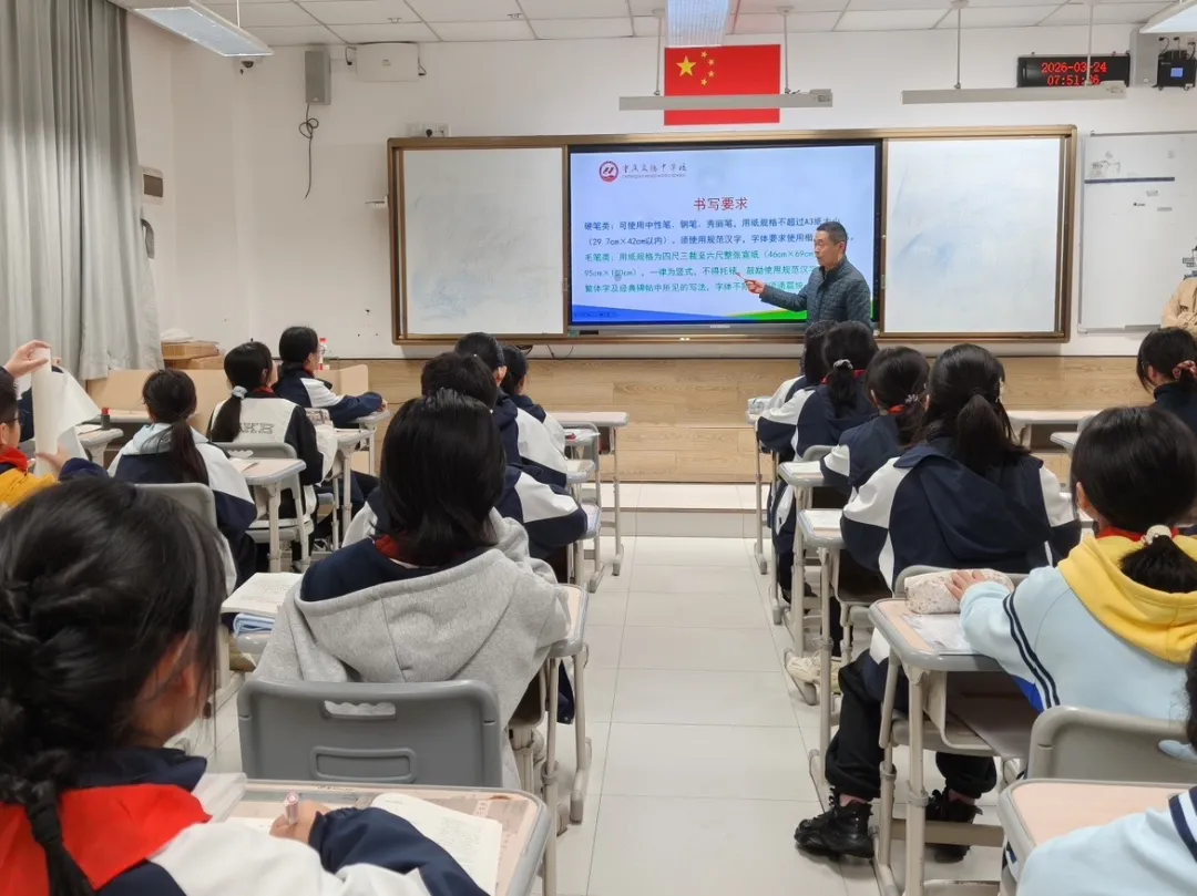 3月24日早晨,初2028届汉字书写大赛年级决赛正式拉开帷幕,江南新城校区和CBD 校区两个赛场同步开启。赛场布置温馨雅致,轻柔舒缓的古琴曲萦绕耳畔,墨香与琴音交融,同学们尽情挥洒笔墨。备课组长胡茜老师、敖天明老师清晰宣读书写要求,现场公布书写内容——龚自珍《己亥杂诗(其五)》,让同学们在书写经典诗词的同时,感悟传统文化的深厚底蕴。