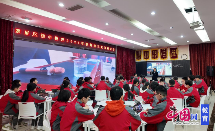 3月26日,宜宾市翠屏区初中物理2026年春期初三复习研讨会在宜宾市翠屏区龙文学校举行。全区九年级物理教师参会,共同探讨初三后期复习教学策略及新课改背景下的试题命制方向。