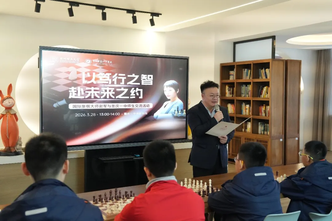 2026年3月28日中午,重庆一中图书馆内气氛热烈,一场融合智力运动、拔尖人才培养与高等教育衔接的交流活动在此举行。深圳理工大学校长助理、教育工作部部长杨帆,国际象棋世界冠军、深圳理工大学讲席教授谢军一行应邀到校,与一中师生围绕拔尖创新人才培养展开深度交流。