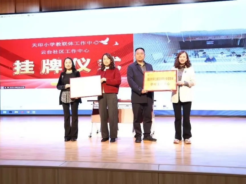 在全场嘉宾的见证下,天印小学书记、校长李雨霖与云台社区党委书记龙明英共同签署共建协议,标志着校社合作正式落地。随后,教委与街道领导共同为“天印小学教联体学校工作中心”“云台社区工作中心”揭牌,并为学校、社区授牌,现场掌声雷动,大家纷纷用镜头记录下这一历史性时刻。