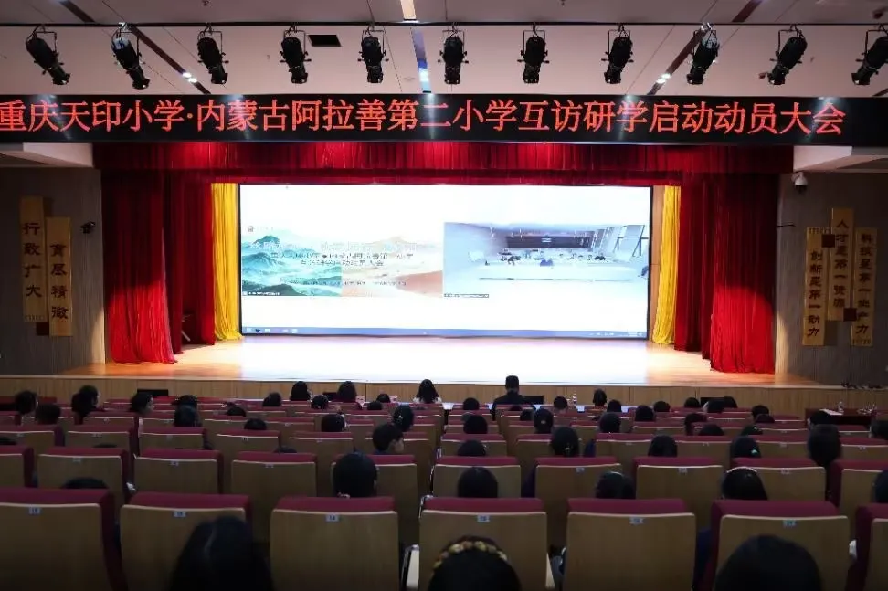 仪式现场,还通过大屏幕实时连线了内蒙古阿拉善高新区第二小学,两校校长分别致辞,正式发布了渝蒙两校互访研学具体方案。未来,天印小学的孩子们将有机会走进草原,体验蒙元文化;内蒙古的小伙伴也将来到山城,感受巴渝魅力,在双向奔赴的研学中拓宽视野、收获成长。