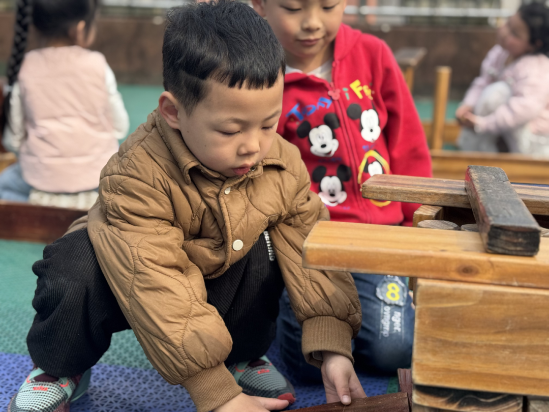 走进建构区,孩子们分工合作:搬运材料、搭校门、建教学楼、筑升旗台。阳光之下,小小建筑师们忙碌又快乐,用双手筑造出专属小学。