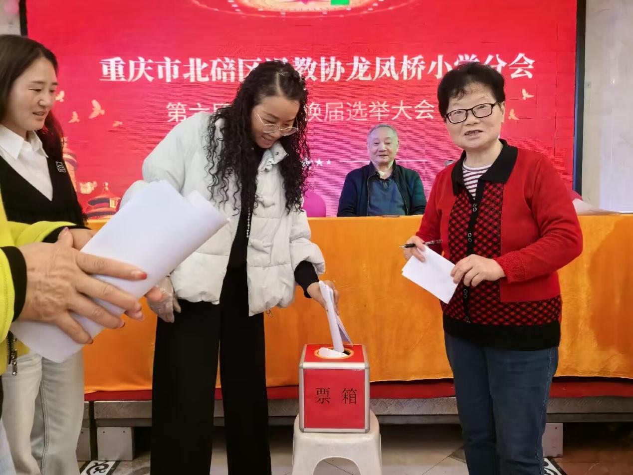 民主选举,产生新班子。按照换届程序,大会严格依规开展选举工作。学校党支部书记、校长费霞宣读《重庆市北碚区离退协教育工作协会关于北碚区退教协龙凤桥小学校分会换届候选人的批复》【碚退教协[2026]7号】,经会员表决通过监票、计票工作人员,随后依次进行清点人数、检查票箱、分发选票、填写投票、开箱计票等环节,全程公开透明、规范严谨。