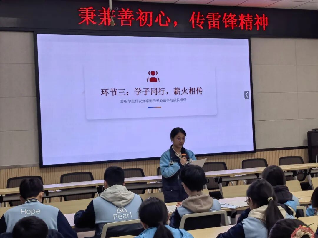 在学子分享环节,周室辰同学率先分享了自己的爱心事迹:从校园里帮扶学业有困难的同学,到参与班级、学校的公益活动,再到校外的志愿服务与关爱家人邻里,他用自己的真实经历,讲述了对雷锋精神、对兼善文化的切身理解。同龄人的分享引发了在场所有珍珠生的强烈共鸣,让大家真切发现,“雷锋”从未走远,榜样就在自己身边,进一步激发了同学们主动传递善意的内生动力。指导老师也对同学们的善举进行了点评,肯定了大家的行动,鼓励更多同学加入到爱心传递的行列中来。