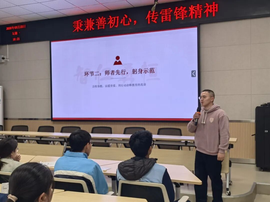 在教师分享环节,办公室副主任朱成翰作为特邀分享嘉宾,结合校园日常、社会公益等多个维度,分享了自己践行爱心行动的真实故事。他用贴近学生的视角,生动诠释了雷锋精神在当代的具体体现,以及作为兼善人,如何将“兼善天下”的理念融入日常点滴行动。