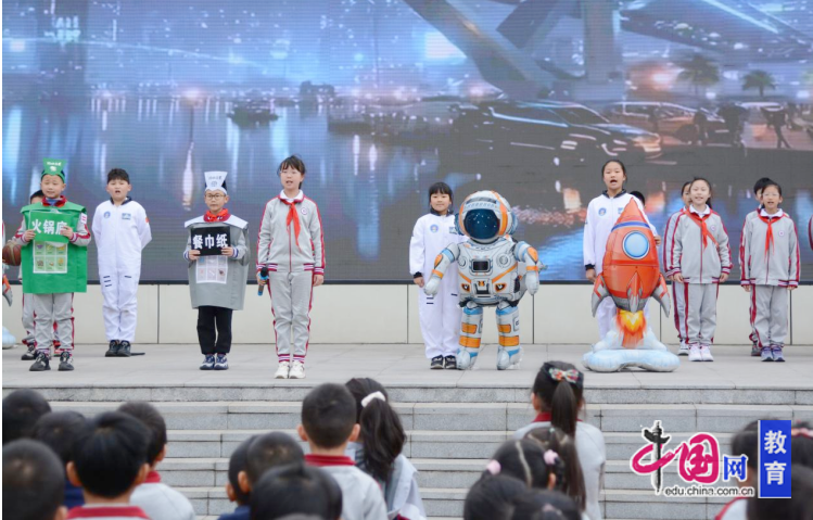 跨时空话环保,情景演绎促觉醒。3月16日,一场构思巧妙的“跨时空对话”在国旗下的舞台上精彩呈现。学生以《当未来科学家挖掘我们的垃圾层》为题,带来了发人深省的集体德育课。活动中,学生们扮演2126年的科研小队,在“考古发掘”中,意外发现地层深处掩埋的并非文明宝藏,而是百年前人类遗留的难以降解的“垃圾伤疤”,引发全体师生深思。面对这一“未来预警”,当下的“少年们”通过律动十足的《垃圾分类要牢记》歌舞,清晰普及“红蓝黑绿”四色垃圾分类法则;借助贴近日常的“我能做到”情景片段,许下从点滴小事践行环保的坚定承诺。剧目尾声,“污染层”悄然消散的巧妙设计,直观传递出深刻启示:每一个微小的环保行动,都在为地球的未来添彩,让生态环保理念深入人心。