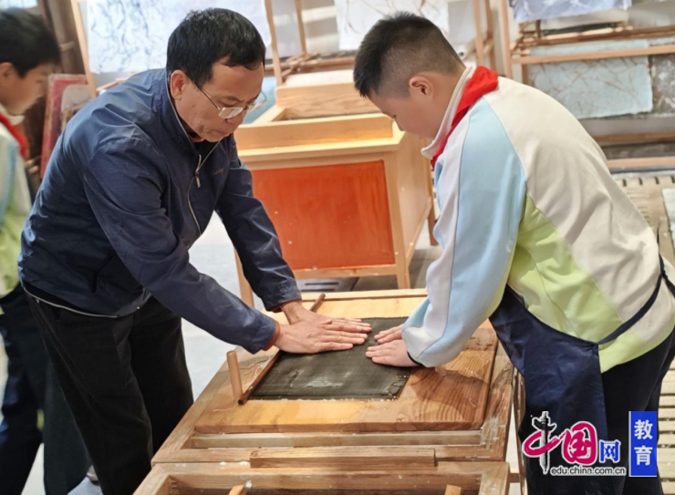 木工坊里,六(4)孩子们打磨木筷,感叹“原来一块木头要变成精致物件,需要这么多耐心”;造纸坊中,六(5)班的孩子亲手抄纸、晾晒,见证一张纸的诞生,朱思燕说:“太神奇了,古人的智慧太了不起”;印工坊内,五(6)班孩子们体验拓印技艺,在一压一拓间感受非遗魅力,纷纷表示“亲手做出来的作品,比课本里的知识更鲜活”;家长代表也参与体验,与孩子共同完成手工作品,见证成长瞬间。