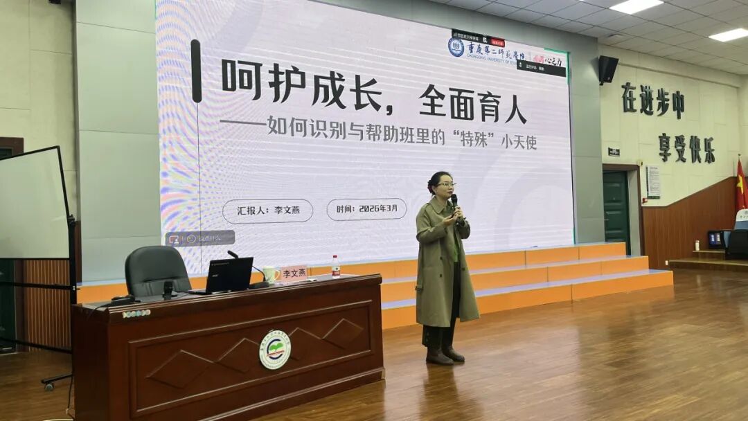 春风育心,健康第一。为进一步提升教师心理健康教育专业素养,精准守护每一位学生身心健康,让每一个孩子都得到适配的成长关怀,2026年3月30日,重庆市大渡口区育才小学特邀重庆第二师范学院儿童创新教育研究所所长李文燕开展《呵护成长,全面育人——如何识别与帮助班里的“特殊”小天使》专题心理讲座。全体教师齐聚学习,聚焦特殊儿童身心发展特点,共探科学、专业的教育支持路径。