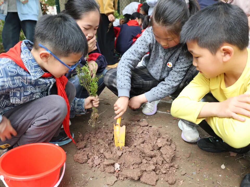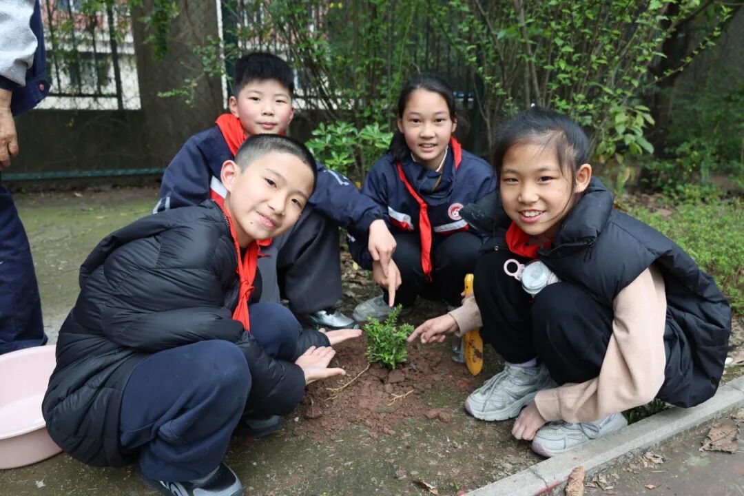 四年级开展植树活动。同学们手持铁锹、水桶,分工协作,挖坑、扶苗、填土、浇水。汗水浇灌着嫩绿的树苗,也浸润着孩子们的心灵。大家纷纷表示将定期呵护树苗成长,见证生命与责任的共同成长。
