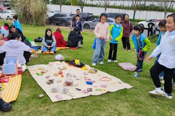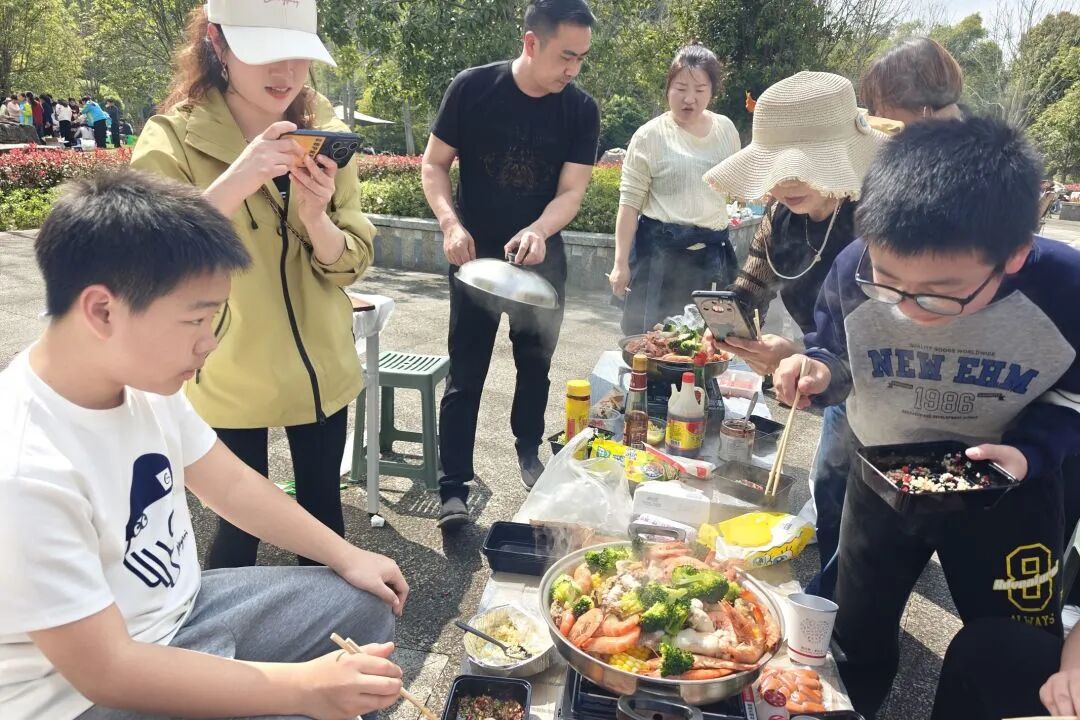抵达竹溪河扎营点后,孩子们铺开餐垫,拿出与家人共同准备的美食,围坐分享。春日的草坪上,不仅有美食的香气,更有分享的喜悦与纯真的友谊。