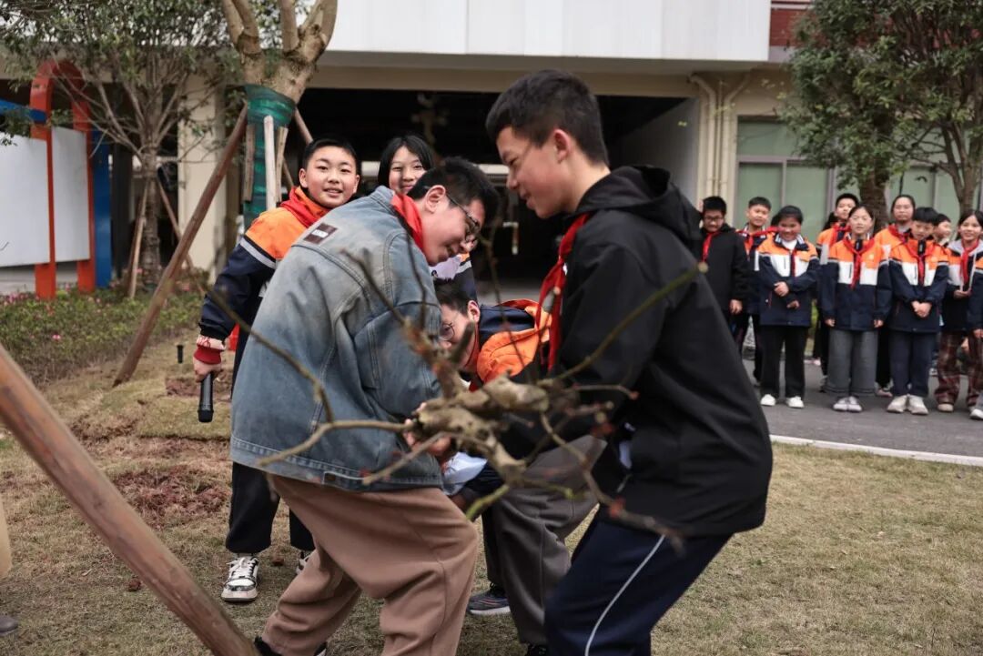 “心有灵犀,行有方向”的呼号在校园回荡。合影的快门声里,孩子们的笑脸被永远定格。活动结束了,但它的意义还在延续。对孩子们来说,这是一次真实的劳动体验。亲手挖土、栽种、浇水,体会了“一分耕耘一分收获”的道理。“这是我第一次种树,我会记得这棵树,也会记得这个春天。”