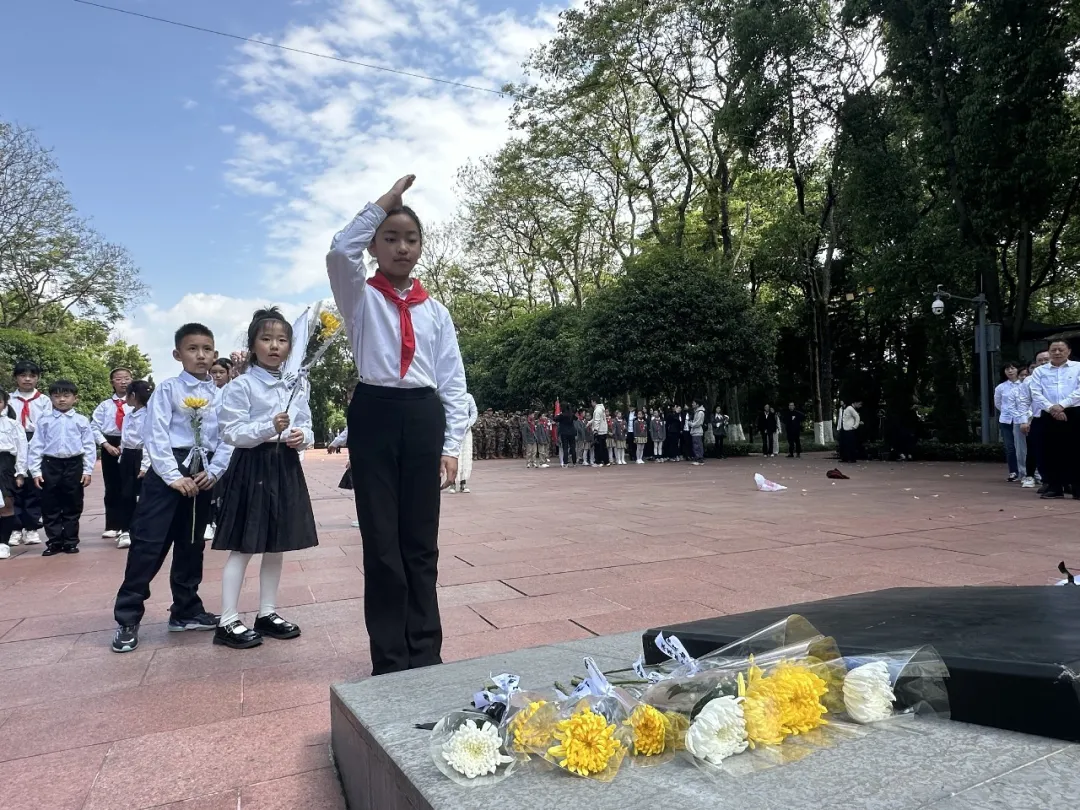 当日下午,全体参与人员在校园集结整队,经安全教育后统一前往祭扫现场。祭扫仪式环节紧密、庄重有序。全体人员整齐肃立,奏唱中华人民共和国国歌与中国少年先锋队队歌。