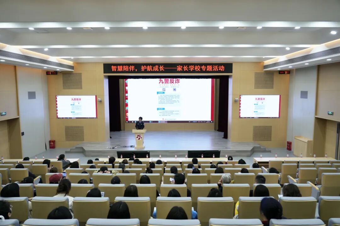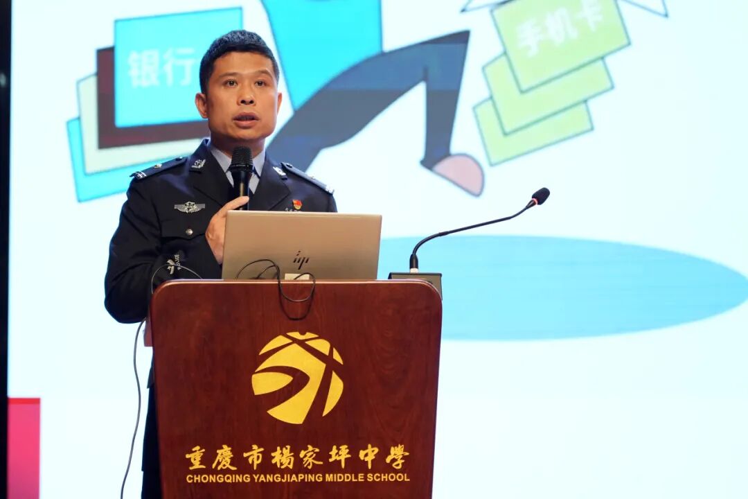 第二场讲座是由九龙坡区公安分局智慧侦查中心黄磊警官和九龙坡区杨家坪派出所吴培培警官带来的安全“必修课”。他们从电信诈骗的形势与危害讲起,用真实数据告诉家长朋友们,电信诈骗并非遥不可及,而是潜伏在每个人身边的隐形威胁。