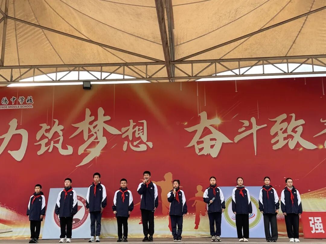 随后,朗诵环节将现场气氛推向高潮。领诵学生带领全体同学齐声诵读《青春颂家园,少年筑华章》。从“青春作笔,山河为卷”到“少年智则国智,少年强则国强”,铿锵有力的诵读声响彻校园,展现了文德学子昂扬向上的精神风貌和拳拳爱国之心。