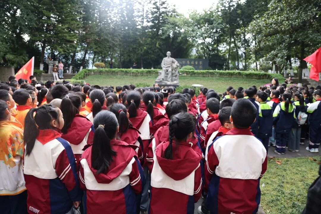 随后,三年级全体学生齐声朗诵《走在北碚的风光里》,用清脆响亮的童声,展现作孚精神引领下北碚日新月异的美好风貌。在鲜艳的少先队队旗下,全体少先队员高举右手庄严宣誓,铿锵有力的誓言在公园上空回荡,彰显着新时代好少年立志向学、勇担使命的坚定信念。最后,队员们有序环绕墓园,庄重行队礼,将崇敬之情与奋进之志牢记心间。