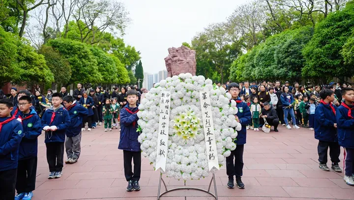 上午8时10分,五年级师生身着统一校服、佩戴红领巾在操场整齐集合,8时30分列队出发,步行前往歌乐山烈士陵园。在烈士墓前,师生们举行庄重的缅怀仪式,李俊洁担任旗手,赵奕涵、赖美依担任护旗手,全体五年级学生齐声朗诵《少年中国说》,用铿锵有力的声音表达对革命英烈的缅怀与敬意,仪式后师生们合影留念。