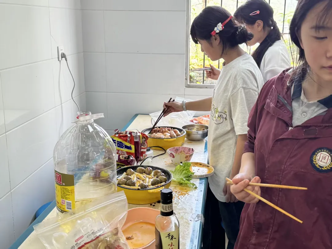 众人拾柴火焰高,各小组分工明确、配合默契,尽显团结协作之姿。同学们纷纷动手实践,大显身手,有的煎烤飘香烤肉,有的烹制入味可乐鸡翅,有的用野葱煎出香软蛋饼,还有的精心筹备暖心火锅。切配翻炒间,动作娴熟利落,在热火朝天的劳作中,充分展现了扎实的动手能力与昂扬的劳动风采。