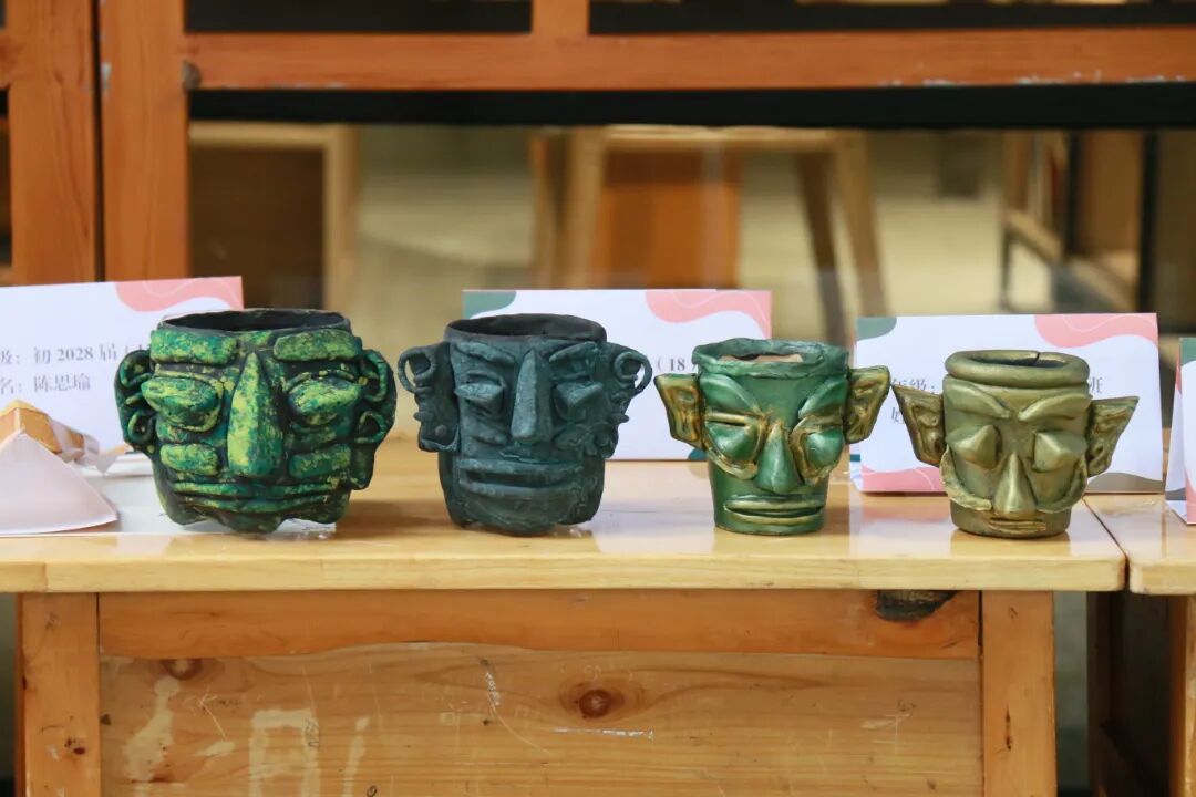 有同学用超轻粘土复刻三星堆面具,纵目棱角间藏着古蜀文明的神秘;有同学用纸板还原唐三彩,骆驼与胡人的神态里满是盛唐气象;有同学雕琢马头鹿角金摇,金色鹿角摇曳着草原贵族的风华;还有同学以陶土为胎,拉坯上釉,捏出青花小瓶与粉釉茶盏,蓝白晕染、粉青点缀,让瓷器的温润雅致在指尖重现。还有同学以黏土为材,复刻出汉朝瓦当,云纹、兽面、吉语文字,古朴的纹路里藏着两汉建筑屋檐下的风雨故事……