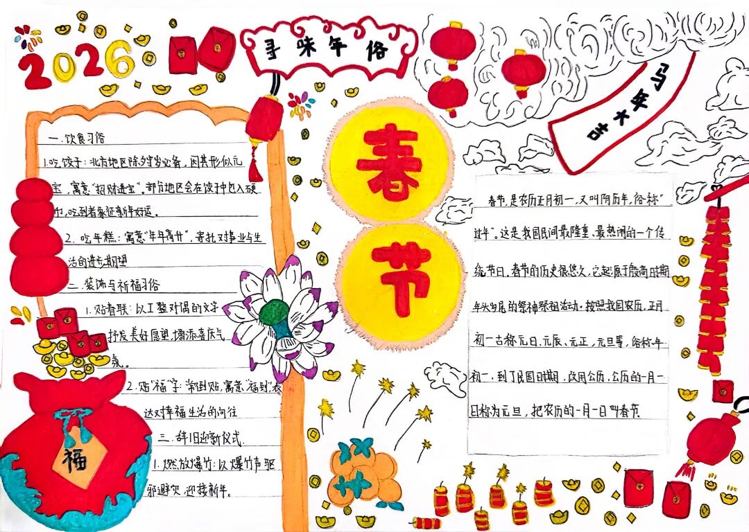 年俗是刻在民族血脉里的文化印记,是团圆、感恩与祝福的生动表达。同学们走进新春烟火,用画笔与文字记录传统年俗之美,贴春联、守岁、吃团年饭……在团圆饭的香气里感受亲情,在民俗仪式中读懂传承,以小报形式呈现“寻味年俗”成果,让年味可感、可触、可珍藏,每一份小报都承载着家国情怀与文化热爱。