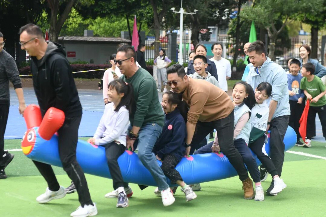亲子运动会赛场活力拉满!此刻,输赢早已不再重要,赛场之上,亲情肆意流淌:跌倒时紧握的双手、冲刺时呐喊的鼓励、胜利时相拥的笑颜,都成为最动人的风景……轮胎趣跑项目中,亲子并肩发力、推轮疾驰,汗水与欢笑在赛道上尽情飞扬。