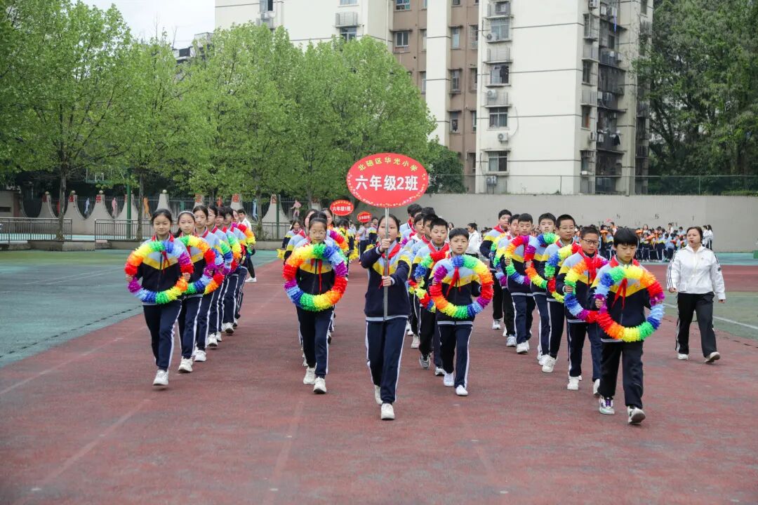 伴随着激昂的运动员进行曲,各年级方队踏着整齐的步伐依次入场,嘹亮的口号响彻校园,红领巾在胸前飘扬,是华光少年最耀眼的模样。