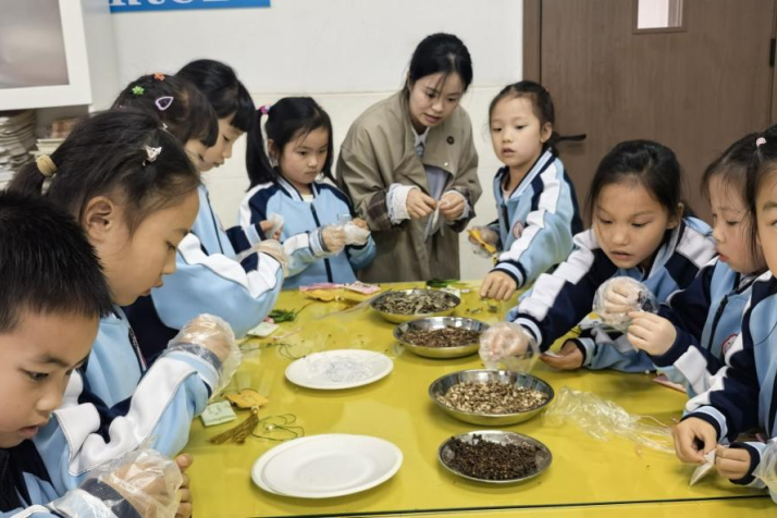 北碚区状元小学举办一年级“清明识香·稚手制香囊”课程