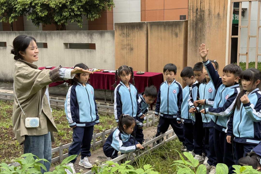 课程伊始,师生共同走进百草园开展实地教学,授课团队带领孩子们近距离辨识艾草、菖蒲、薄荷等驱蚊中药材。在引导学生细致观察植物形态、触摸感知植株特性的基础上,刘晏玲专家通过趣味提问引导孩子主动思考,随后结合药材特性进行专业讲解,明确各类药材的入药部位与最佳采摘时机:艾草、薄荷以叶片入药,夏季生长旺盛期为最佳采摘时段;石菖蒲根茎为核心入药部位,秋季地上部分枯萎、养分回流根茎时药效最佳,其叶片不做入药使用;丁香则以花蕾入药,花蕾刚由绿转红时采摘为宜,更是为香囊增添香气的点睛之材,同时让孩子们知晓药材根部自带独特气味的特点,在直观体验中夯实中医药基础认知。