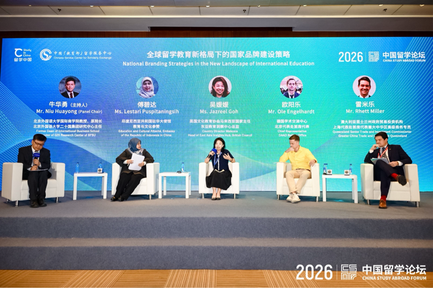 在“全球留学教育新格局下的国家品牌建设策略”专题中,北京外国语大学国际商学院教授牛华勇主持,印度尼西亚驻华使馆教育与文化参赞傅碧达、英国文化教育协会代表吴媛媛、德国学术交流中心北京代表处首席代表欧阳乐、澳大利亚昆士兰州政府代表雷米乐参与讨论。与会嘉宾围绕国家品牌战略定位、资源整合及数字化背景下的发展挑战进行了深入交流。